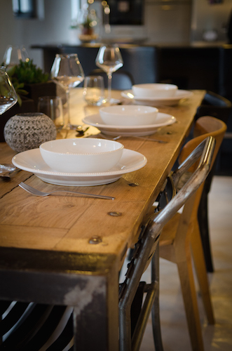 Table de séjour ÉMILIE. Table réalisée à partir d'une porte de grange en chêne massif, piètement acier verni. 10 pers.